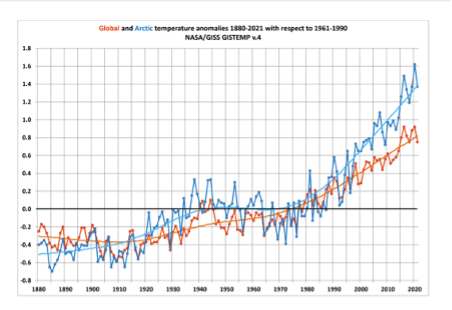 Se på kurven over temperaturudviklingen i verden og i Arktis siden 1880.
